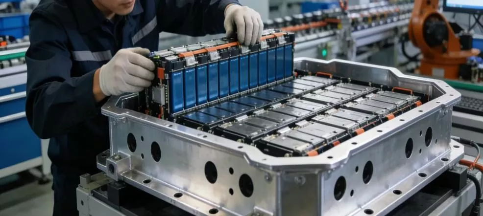 Settore dei trasporti: primo piano del gruppo telaio del pacco batterie di un veicolo ad energia nuova