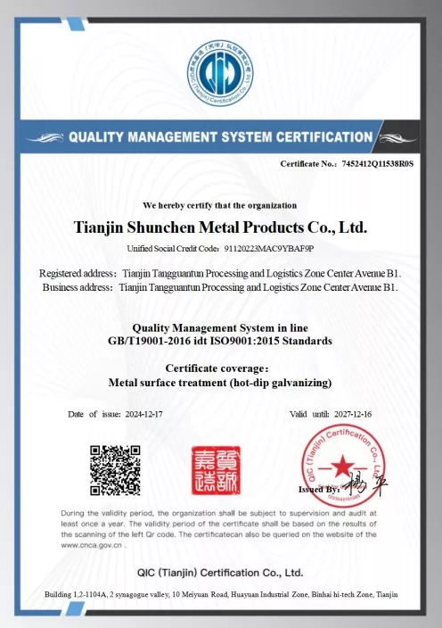 Processo di zincatura: zincatura a caldo (spessore dello strato di zinco ≥ 85μm), elettrozincatura (spessore dello strato di zinco ≥ 12μm), conforme allo standard GB/T 13912-2020;