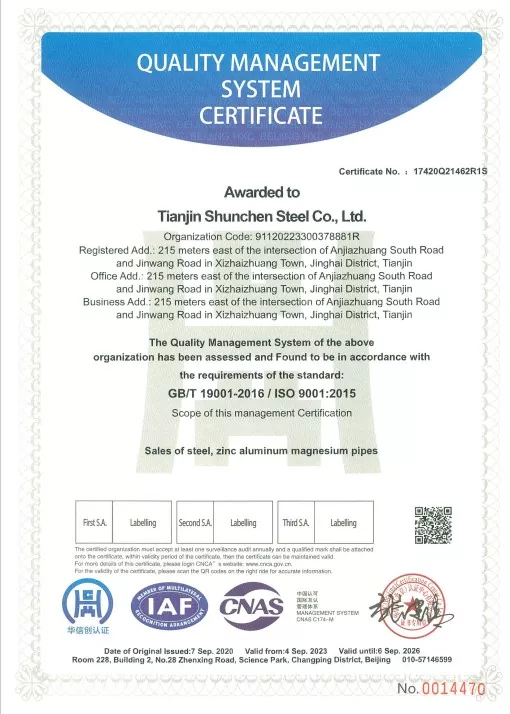 Standard: GB/T 3091-2015 "Tubi in acciaio saldati per il trasporto di fluidi a bassa pressione", GB/T 13912-2020 "Tubi in acciaio zincato a caldo". Il prodotto ha superato test di terze parti e dispone di un rapporto di prova.